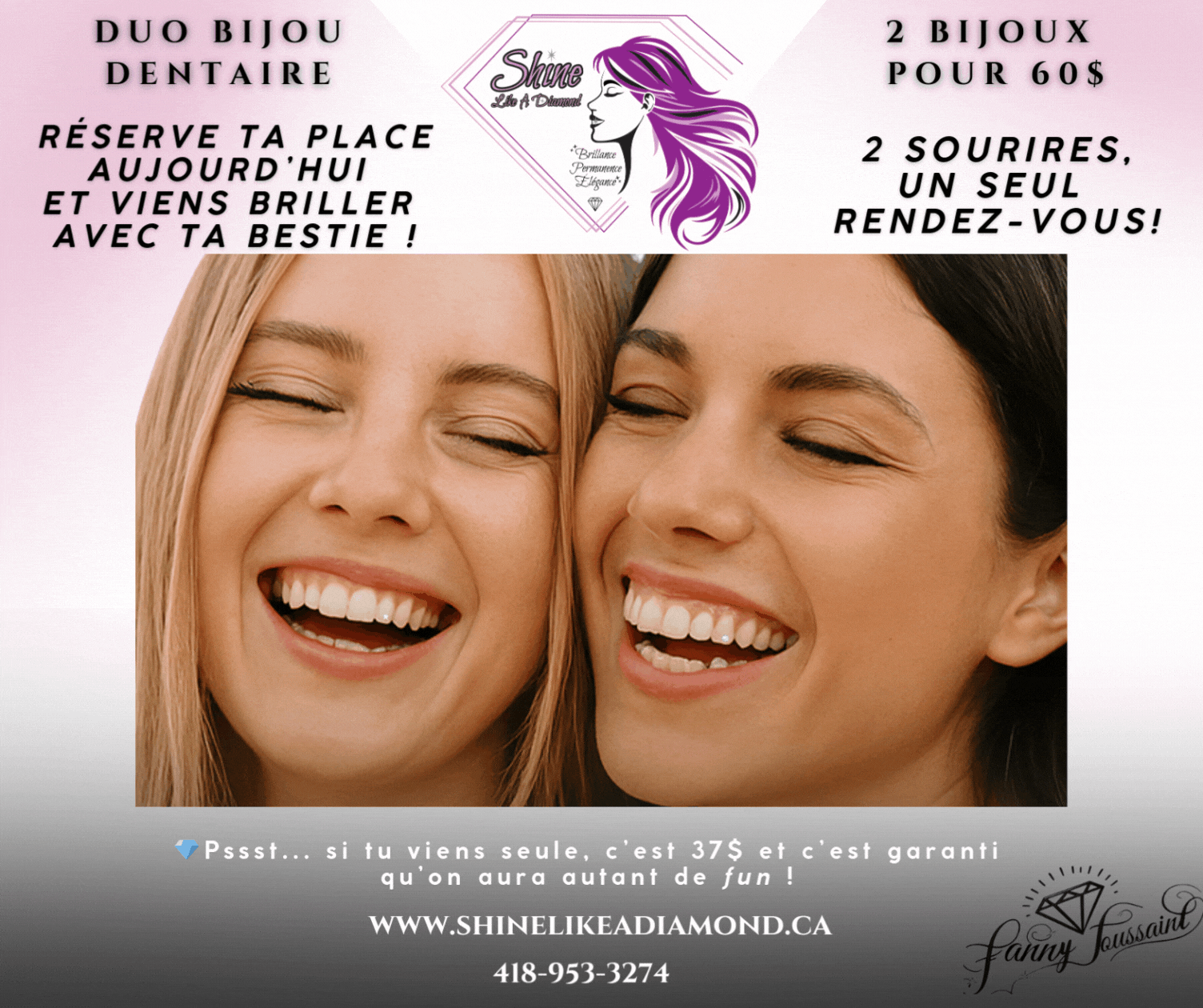 Parfait pour personnaliser et illuminer votre sourire, plusieurs choix de bijoux sont disponibles. Nous utilisons une colle de qualité, tout comme celle des dentistes qui l'utilise pour la pose de bagues métalliques (broches). Facile à poser, sans douleur, ce bijou est simplement fixé sur l'émail. Alors, pourquoi ne pas essayer ce nouvel accessoire de mode pour sublimer votre sourire en toute simplicité? SERVICE À DOMICILE DISPONIBLE ! Que ce soit pour vos soirées de filles ou pour un évènement spécial, tel qu'un enterrement de vie de jeune fille; Groupes de 5 personnes minimum pour obtenir le service à l’endroit de votre choix. * certains frais supplémentaires peuvent s’appliquer selon la distance à parcourir.